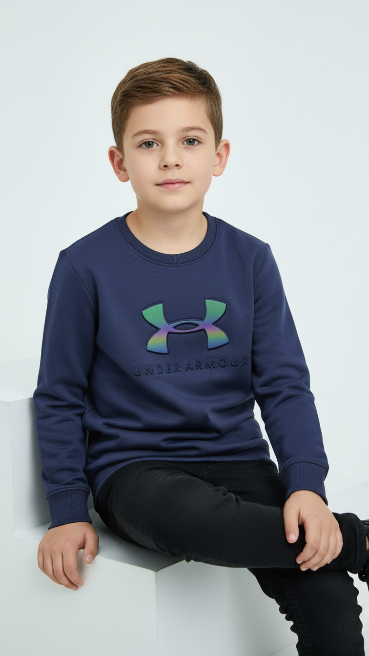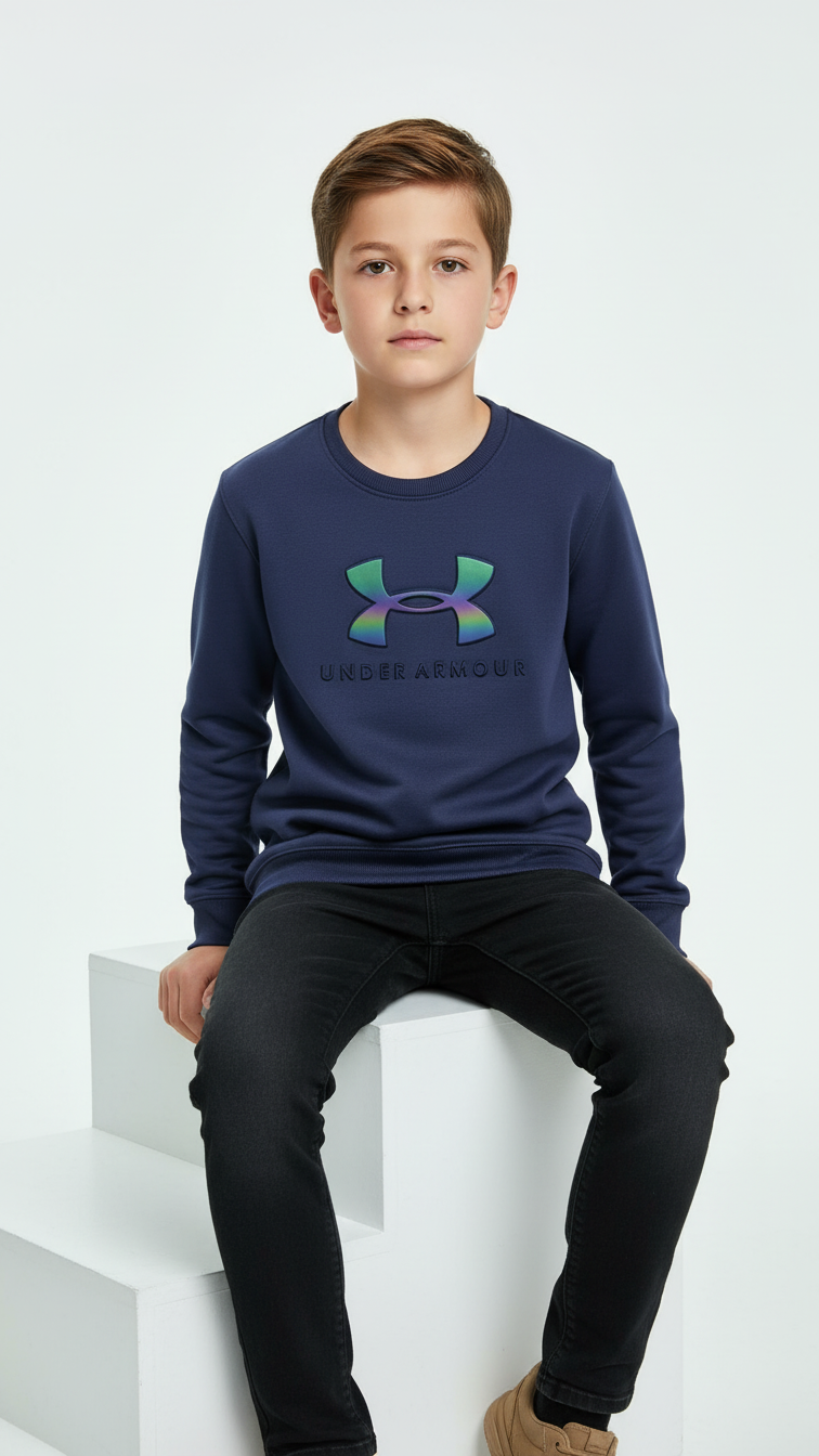 Define your child’s style with this Trendium essential. This Jet blue sweatshirt features a high-contrast, metallic-finish UA logo that shifts colors with every movement. Crafted from our signature Shine Fleece, it offers a bold, modern look that is perfect for school, sports, or urban streetwear.